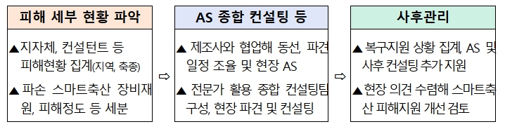 이를 위해, 농식품부와 축산물품질평가원은 합동 TF팀 설치해 피해상황 파악, 긴급 AS지원, 종합컨설팅팀 파견 등 피해 복구를 집중 관리해 오고 있다.