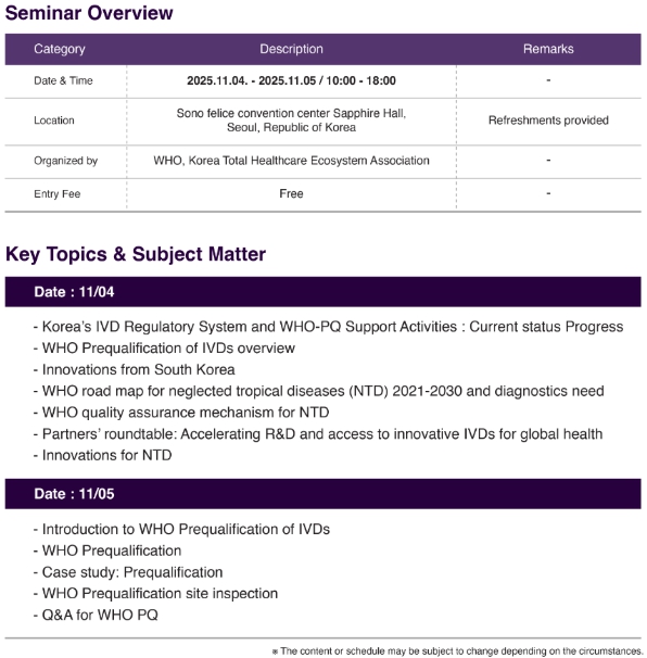 세미나에서는 WHO의PQ 제도 개요와 평가 절차 소개 및 PQ 인증에 필요한 자료 요건과 실제 심사 사례 발표, 식약처의 국내 기업 대상 WHO-PQ 인증 지원 사업 안내 등을 통해 우리 기업의 WHO PQ 제도 이해를 돕는다. 또한 PQ 인증을 준비하는 체외진단의료기기 제조기업과 WHO 담당자 간 1:1 맞춤형 상담 세션도 함께 진행된다.
