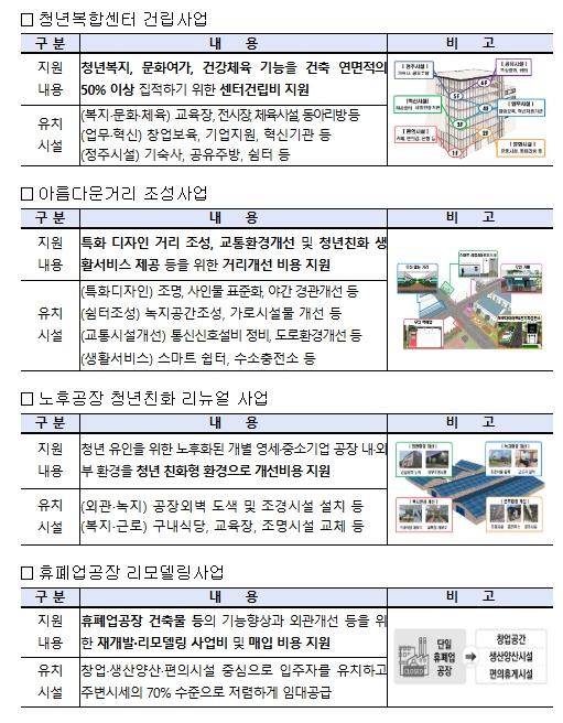 이에, 산업부는 낙후된 산업단지를 청년이 찾는 매력적인 공간으로 전환하기 위해 민간대행사업(’10~), 산업단지환경개선펀드(’11~), 정부출연사업(’15~) 등 다양한 방식의 구조고도화 사업을 추진해왔다. 특히, ’15년부터 추진한 정부출연사업으로 224개 사업에 총 1조 3천억원을 투자하여 복지·문화·편의시설 확충, 노후 공장 환경개선, 휴폐업공장 리모델링 등을 지원했다. ’24년에는 청년문화센터 30개, 아름다운거리 조성 30개, 휴폐업공장 리모델링 2개, 노후공장 청년친화 리뉴얼 15개 등 전년보다 대폭 증가한 총 77개 신규사업을 선정했다.