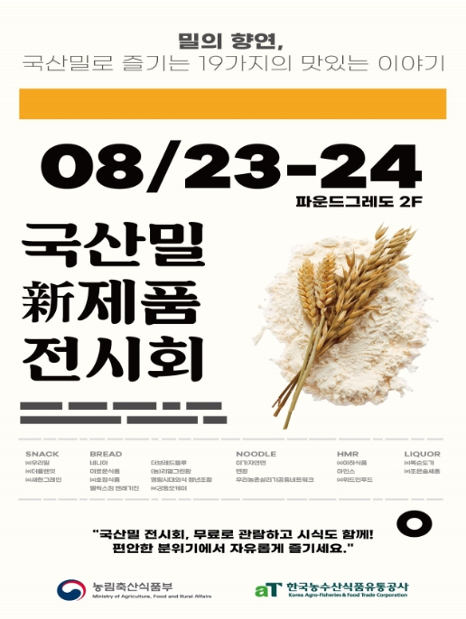 [뉴스서울] 농림축산식품부와 한국농수산식품유통공사는 8월 23일부터 24일까지 파운드그레도(서울 노원구 소재)에서 ‘밀의 향연! 국산밀로 즐기는 19가지의 맛있는 이야기, 국산밀 신제품 전시회’를 개최한다.