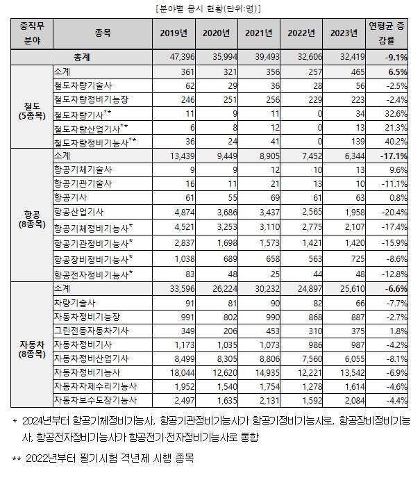 철도, 항공 및 자동차 분야 필기시험 응시자 인원은 최근 5년(‘19년~’23년) 연평균 9.1% 감소했다.