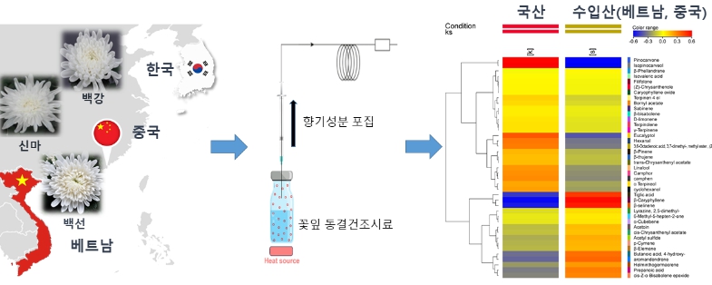 국내에 주로 수입되는 베트남 및 중국산 국화의 경우, 우리나라에 비해 위도가 낮아 고온의 재배환경이 유지되어 향기 성분의 종류와 함량이 국내산 국화와 다른 것을 확인했다. 국내산 국화는 향기가 쉽게 확산되는 성분(eucalyptol, camphen, pinocarvone)이 많은 반면 수입산 국화에서는 이러한 성분이 상대적으로 적어 국화 향을 약하게 느낄 수 있는 요인이 된다.