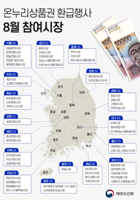 [뉴스서울] 해양수산부는 여름 휴가철을 맞이하여 8월 3일부터 8월 9일까지 7일간 전국 54개 시장에서 '8월 온누리상품권 환급행사'를 개최한다.