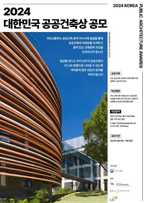 [뉴스서울] 국토교통부는 우수 공공건축 사례와 성과를 공유하기 위하여 8월 12일부터'2024 대한민국 공공건축상'공모를 실시한다.