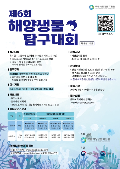 [뉴스서울] 청소년들에게 무궁무진한 가능성을 품은 ‘바다’를 과학적으로 탐색할 수 있는 기회를 제공하는 ‘제6회 해양생물 탐구대회’가 열린다. 이 대회는 해양수산부가 후원하고 국립해양생물자원관이 주최하며, 5월 7일부터 6월 7일까지 온라인으로 참가 접수를 받는다.