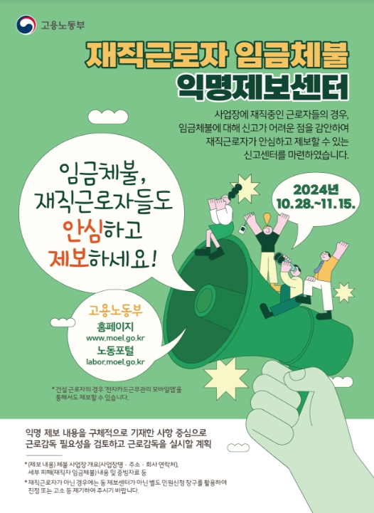 고용노동부는 재직 근로자의 체불이 여전히 많은 상황을 고려하여 익명제보센터를 10월 28일부터 3주간 추가로 운영하기로 했다. 특히 이번 제보 기간에는 건설근로자가 손쉽게 제보하도록 건설근로자공제회에서 운영하는 전자카드 근무관리 모바일 앱을 통해서도 제보를 할 수 있다.