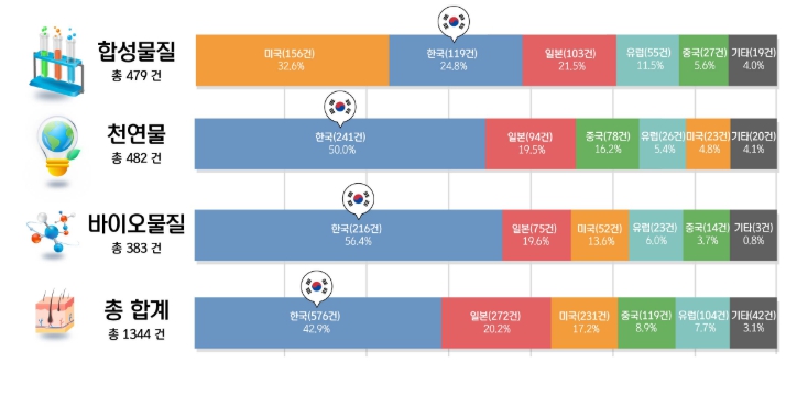 성분 유형별로는 ㈜아모레퍼시픽이 천연물 분야 1위(40건), ㈜케어젠이 바이오 물질 분야 1위(115건)를 차지해 천연물·바이오 물질 분야에서 우리 기업의 우위를 확인할 수 있었다.