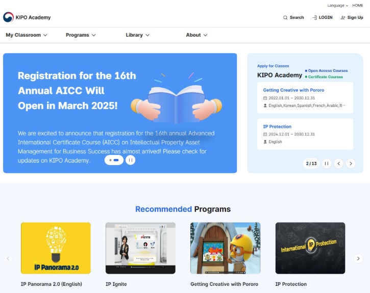 [뉴스서울] 특허청 국제지식재산연수원은 전 세계 외국인(일반인, 기업인, 학생, 공무원 등)을 대상으로 지식재산 교육 서비스를 제공하는 '국제 지식재산 교육 플랫폼(키포 아카데미)'을 새롭게 개편하여 22일부터 서비스를 개시한다고 밝혔다.