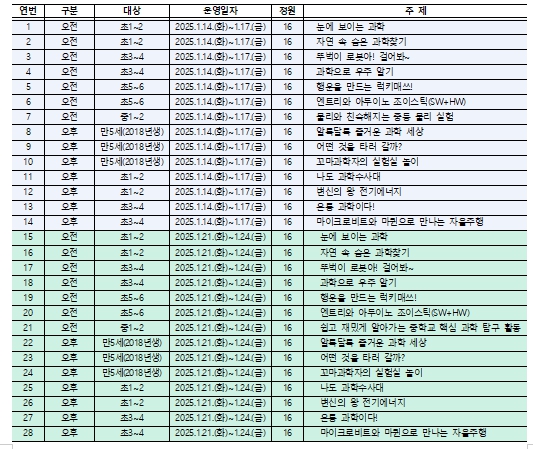 한편, 국립중앙과학관에서는 25년에도 다양한 과학교육 프로그램이 개설될 예정이다. 1월 겨울방학 기간에는 겨울방학 과학교실과 과학캠프가 진행되고, 3월부터는 유아, 초, 중학생을 대상으로 주말에 진행되는 주말과학교실과 4월부터는 유아(단체)를 대상으로 새싹과학교실이 연중 진행될 예정이며, 7,8월 여름방학 기간에는 인공지능과 전통과학을 융합한 과학캠프와 과학교실이 진행될 예정이다.