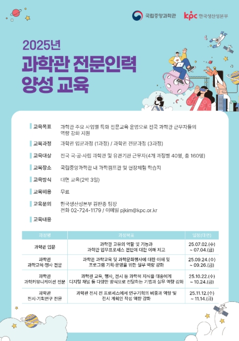 [뉴스서울] 과학기술정보통신부 국립중앙과학관은 7월 2일부터 전국 국·공·사립 과학관 및 유관기관 근무자들의 업무역량 강화를 위한 '2025년도 과학관 전문인력양성 교육' 사업을 시행한다고 밝혔다.