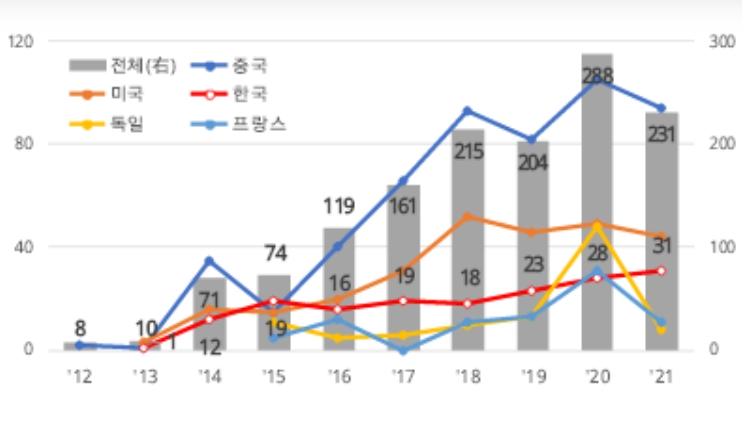 최근 10년간 가장 많은 출원을 한 국가는 중국(38.6%, 533건)이며, 미국(20%, 276건)이 그 뒤를 이었다. 한국은 12.1%(167건)로 3위를 차지했으나, 최근 5년간 가장 높은 출원량 증가를 보여(연평균 13%), 앞으로 더욱 빠른 성장이 기대된다.
