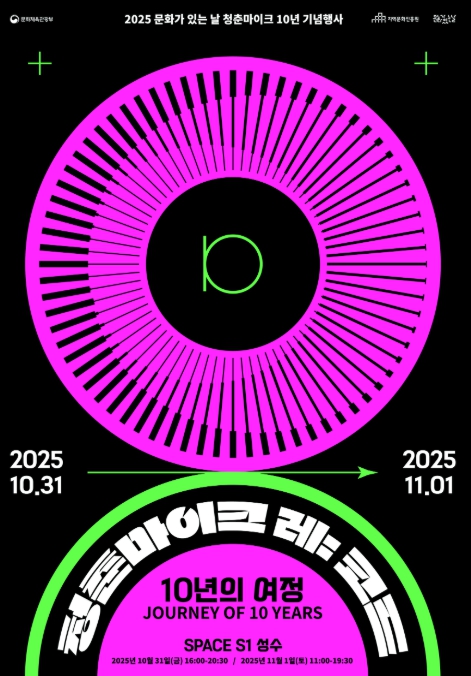 [뉴스서울] 문화체육관광부는 지역문화진흥원과 함께 10월 31일부터 11월 1일까지 복합문화공간 ‘스페이스 에스원(SPACE S1, 서울 성동구)’에서 ‘문화가 있는 날 청춘마이크’ 10주년 기념행사 ‘청춘마이크 레:코드-10년의 여정’을 개최한다.