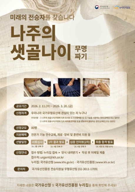[뉴스서울] 국가유산청은 국가유산청 산하 국가유산진흥원과2월 11일부터 3월 20일까지 단절 위기의 국가긴급보호무형유산인 '나주의 샛골나이(무명짜기)'의 미래 전승자 발굴을 위한 공모를 진행한다.