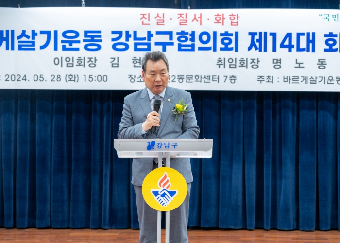 김형대 의장은 축사를 통해“그동안 탁월한 지도력과 헌신적인 봉사로 지역발전과 협의회 활성화에 힘써주신 김현율 회장님의 노고에 감사드린다”라며 “새롭게 선출되신 명노동 회장님께서 앞으로 바르게살기운동 강남구협의회의를 힘차게 이끌어 주시길 기대한다”라고 말했다.