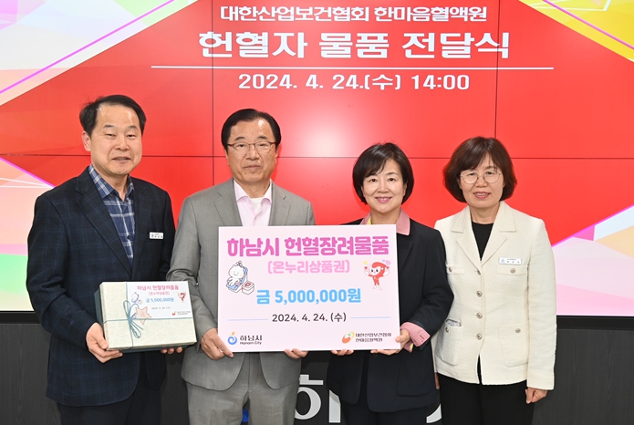 [뉴스서울] 하남시가 24일 시청 본관 시장실에서 ‘2024년 헌혈자 지원 물품 전달식’을 열고 대한산업보건협회 한마음혈액원에 온누리상품권 1만원권 500장을 기증했다.