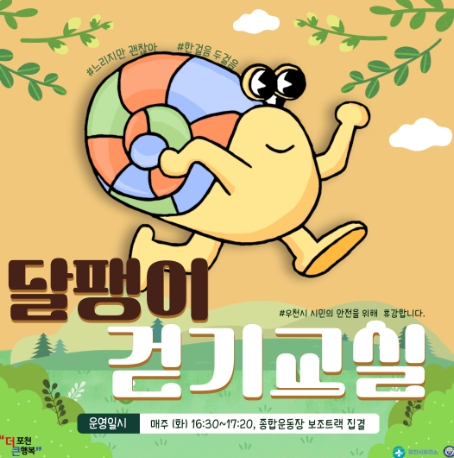 [뉴스서울] 포천시는 오는 4월 16일부터 10월 29일까지 매주 화요일 16시 30분부터 17시 20분까지 군내면 종합운동장 보조트랙 집결지에서 달팽이 걷기운동 교실을 실시한다.