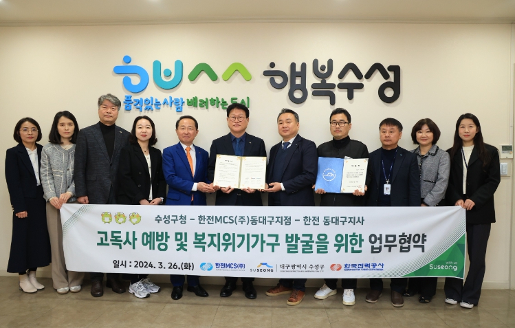 [뉴스서울] 대구 수성구는 지난 26일 한전MCS(주) 동대구지점, 한국전력공사 동대구지사와 복지위기가구 발굴・지원 및 고독사 예방을 위한 업무협약을 체결했다.