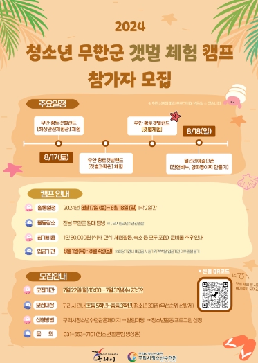 [뉴스서울] 구리시청소년재단 청소년수련관은 관내 초등 5학년 ~ 중등 3학년 청소년 30명을 대상으로, 오는 8월 17일부터 18일까지 1박 2일로 ‘2024 청소년 무안군 갯벌 체험 캠프’를 진행한다.