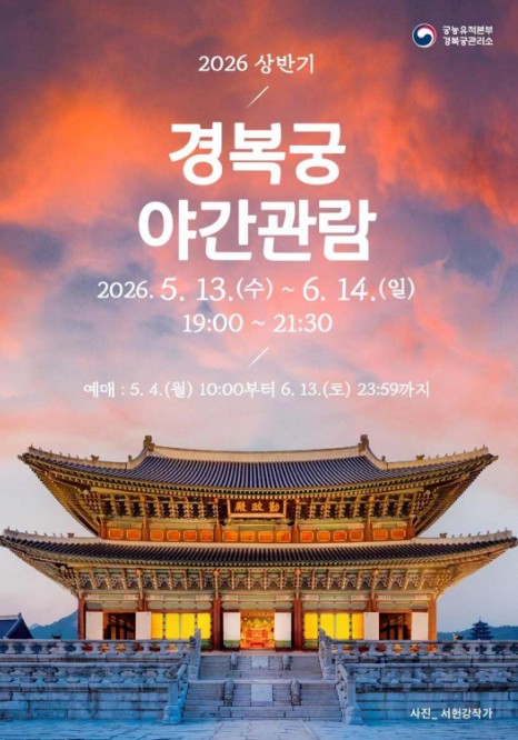 [뉴스서울] 국가유산청 궁능유적본부 경복궁관리소는 5월 13일부터 6월 14일까지 '2026년 상반기 경복궁 야간관람'을 운영하며, 5월 4일 오전 10시부터 온라인 예매(선착순)를 시작한다.
