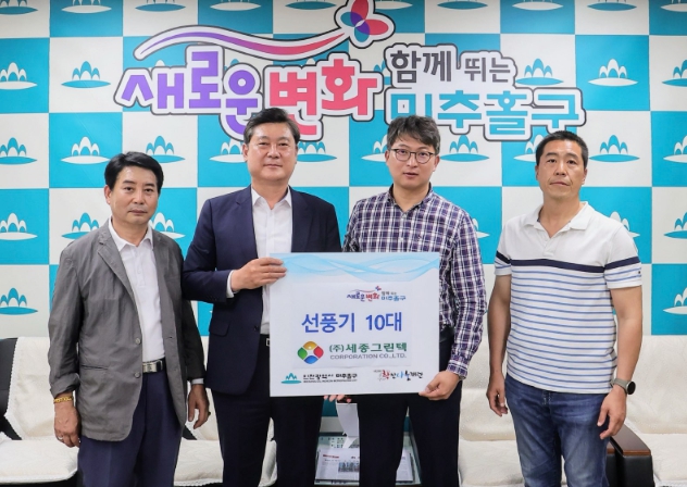 [뉴스서울] 인천 미추홀구는 19일 ㈜세종그린텍으로부터 관내 취약계층의 시원한 여름 나기를 위한 선풍기 10대를 전달받았다.
