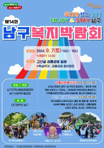 ‘무지개가 뜨는 도시- ENJOY·STAY 남구’를 행사슬로건으로 앞산 고산골 공룡공원 일원에서 진행되는 이번 박람회는, 지역의 복지 관련 기관․단체․시설 등 40여 곳이 참여하며,‘남구지역사회보장협의체’와 ‘남구사회복지협의회’가 공동 주관하고, ‘대구광역시 남구청’이 후원한다.