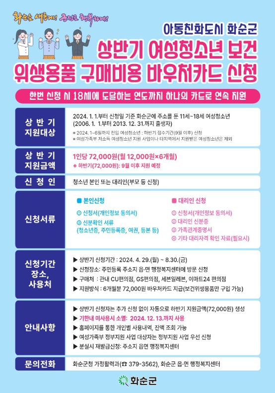 [뉴스서울] 화순군은 여성청소년에게 월 1만 2,000원의 위생용품 구매를 지원하는 '여성청소년 보건위생용품 보편 지원 사업'의 상반기 접수를 4월 29일부터 8월 31일까지 주소지 읍·면사무소에서 신청받는다고 밝혔다.