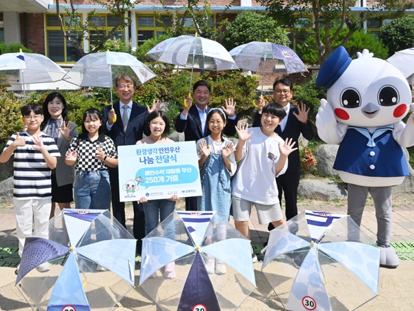 서구는 12일 광주 신세계, 초록어린이재단 광주가정위탁지원센터와 함께 상무초등학교 학생들에게 폐현수막을 재활용한 ‘환경생각(환생)안전우산’을 전달했다.