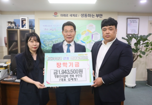 [뉴스서울] 부안군은 지난 7일 명륜진사갈비 부안점은 부안군 근농인재육성재단을 방문하여 지역인재육성을 위한 장학금 1,943,500원을 기탁했다.