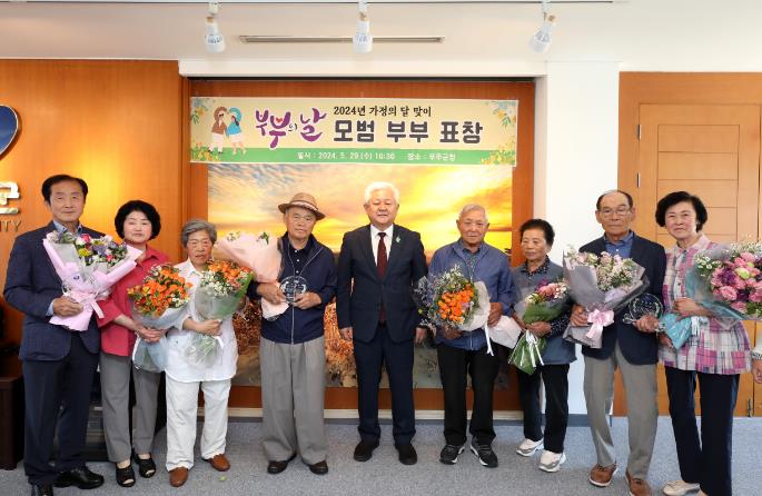 [뉴스서울] 무주군은 가정의 달 부부의 날을 기념해 지역 내 모범 부부 6쌍을 선정, 29일 군청(군수실)에서 시상했다고 밝혔다.