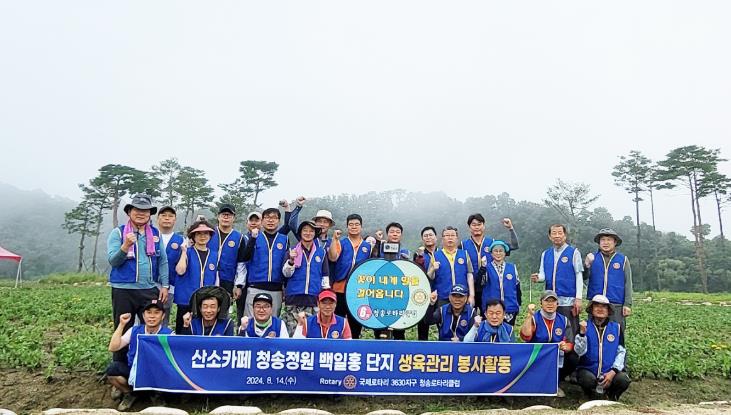 이번 봉사활동은 청송군 파천면 신기리 일원 4만2천평의 부지에 조성된 백일홍 정원인 ‘산소카페 청송정원’ 중 청송로타리클럽에서 관리위탁 받은 1천여평에 대한 제초작업, 시비 등 생육관리를 위해 회원들이 참여했으며, 아침 6시부터 8시까지 2시간 동안 진행되었다.