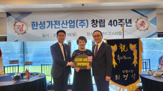 [뉴스서울] 지난 16일 한성가전사업(주) 40주년 행사를 기념해 김한조 회장이 고향인 남원시에 고향사랑기부금을 기탁했다.