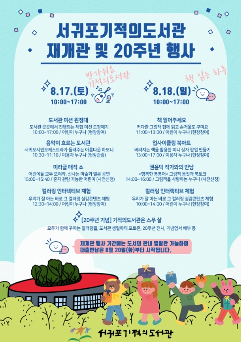 서귀포시 도서관운영사무소는 지난 4월 시작한 서귀포기적의도서관 시설개선사업이 마무리됨에 따라 8월 17일과 18일 재개관 및 20주년 행사를 개최하고 8월 20일부터 정상운영한다고 밝혔다.
