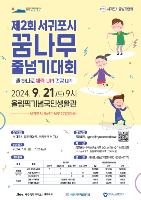 [뉴스서울] 서귀포시는 7월 8일부터 7월 26일까지‘제2회 서귀포시 꿈나무 줄넘기대회’에 참가를 희망하는 유아와 초등학생을 모집하고 오는 9월 21일 올림픽기념국민생활체육관에서 대회를 개최한다.