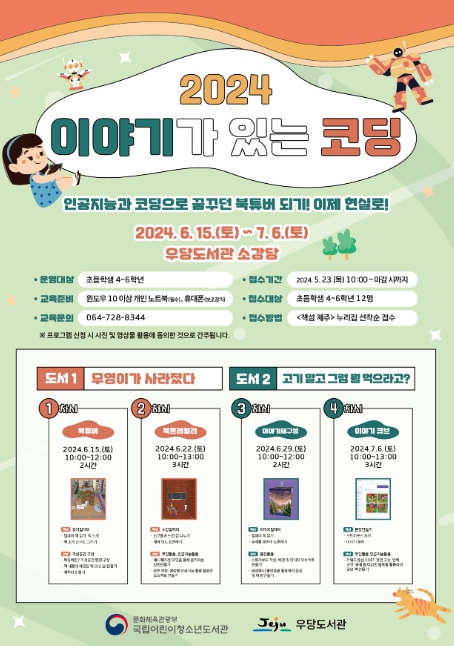 [뉴스서울] 제주시 우당도서관은 국립어린이청소년도서관이 공모한 '2024년 이야기가 있는 코딩' 사업에 선정돼 오는 5월 23일부터 프로그램 참여자를 모집한다.