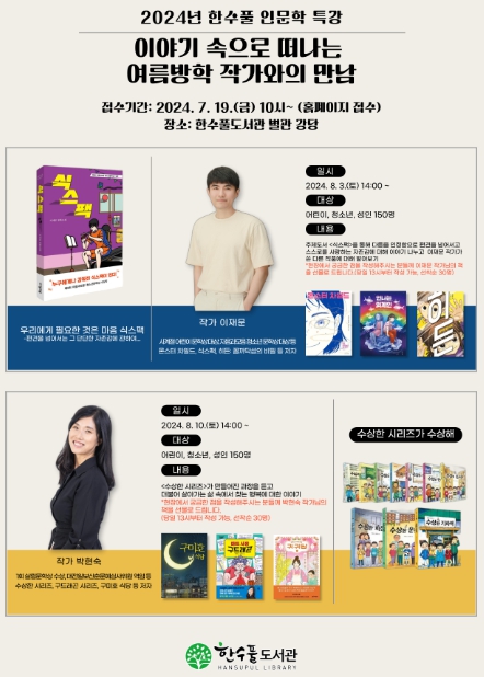 [뉴스서울] 한수풀도서관은 지역주민을 대상으로 다양한 분야의 저자를 초청하여 도서관 역할을 홍보하고자 '한수풀 인문학 특강 - 이야기 속으로 떠나는 여름방학 작가와의 만남'을 8월 3일(토), 10일(토)에 운영할 예정이다.