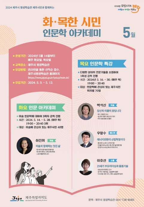[뉴스서울] 제주시는 시민들의 인문학적 소양을 갖추기 위한 '화·목한 시민 인문학 아카데미'를 5월부터 9월까지 운영한다.