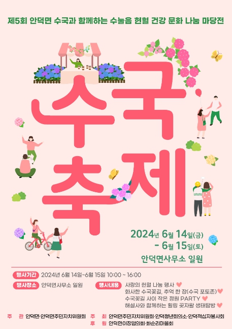 [뉴스서울] 서귀포시는 제5회 안덕면 수국과 함께하는 수눌음 헌혈·건강 문화 나눔 마당전이 오는 6월 14일 ~ 6월 15일 양일간 안덕면사무소 일원에서 개최된다고 밝혔다.