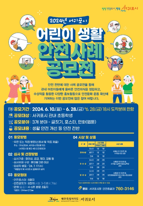 서귀포시 관계자는 어린이들이 일상생활에서 발생할 수 있는 안전사고에 대해 경각심을 갖고 주의를 기울이는 계기가 되길 바라며, “이번 공모전을 통해 어린이들이 안전에 대한 기발한 상상력을 마음껏 표현해주기를 바란다”고 밝혔다.