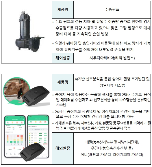 선정된 제품들은 사우디아라비아 발전소 수요 수중펌프, 네팔 및 우간다 농림부 수요 AI기반 송아지 정밀사육 시스템, 파라과이 및 캄보디아 수요 산불지연제, 필리핀 수요 희귀질환 변이분석 솔루션, 미국 국립보건원 수요 3차원 현미경 등 향후 해외 공공 조달시장 진출에 유망한 제품들이다.
