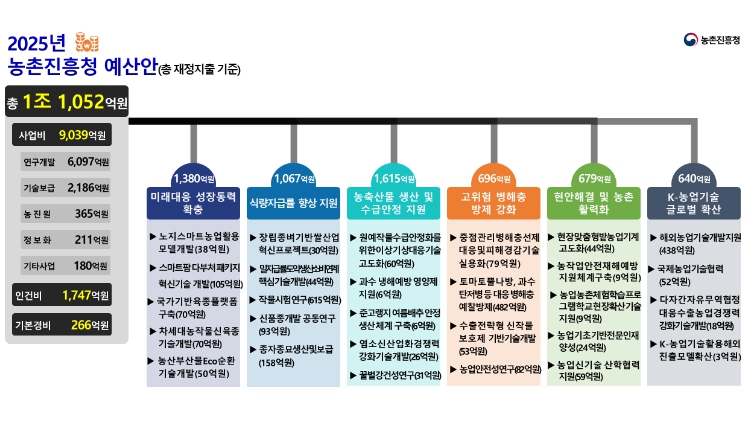 농진청은 미래대응 성장동력 확충, 식량 자급률 향상, 농축산물 생산 및 수급안정, 농업·농촌 활력화 등 핵심과제 성과 창출을 위한 분야에 2025년 예산을 중점 투자할 계획으로 세부 내용은 농업을 미래성장 산업으로 육성하기 위한 스마트농업 확산, 디지털 육종모델 개발 및 푸드테크 산업화 지원에 1,380억원을 투자한다.