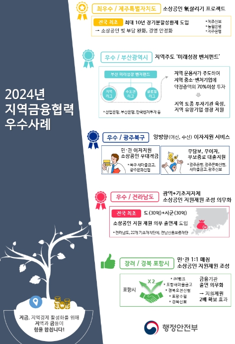 지역금융 협력 최우수 지자체는 소상공인 경영안정자금 대출에 대해 전국 최초로 최대 10년 장기분할 상환제를 도입한 ‘제주특별자치도’가 선정됐다.