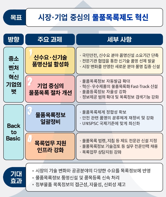 조달청은 시장·기업 중심의 물품목록제도 혁신을 위해 新수요·新기술 품명 신설 활성화, 물품목록화 절차 개선, 물품목록 분류체계 정비, 지원 인프라 강화 등 4대 과제를 마련했다.