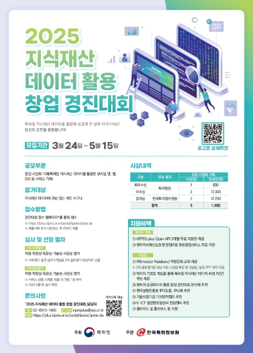 [뉴스서울] 특허청은 특허·상표·디자인 같은 지식재산 데이터를 활용해창의적인 사업 아이디어를 발굴하고 창업 활성화를 위해 3월 24일~5월 15일까지 ‘2025년 지식재산 데이터 활용 창업경진대회’ 참가자를 모집한다고 밝혔다.