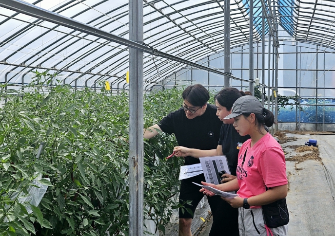 ▲ 하우스 시설에서 고추 탄저병 방제 효과를 확인하는 연구진 |