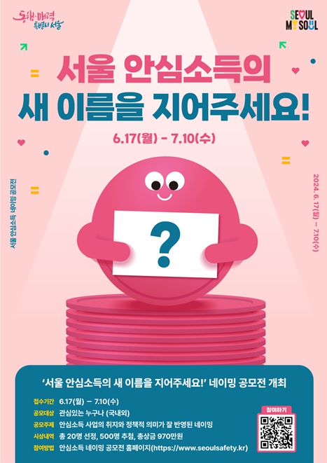 공모전은 6월 10일 공고를 시작으로 6월17일부터 7월10일까지 4주간 접수를 진행하며, ‘서울 안심소득’ 정책 특징을 반영한 명칭이라면, 국내·외국인, 지역‧연령 관계없이 누구나 참여할 수 있다.