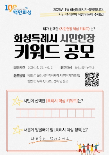 [뉴스서울] 화성시가 2025년 1월 특례시 출범을 앞두고 시민과 함께하는 ‘화성특례시 시민헌장’ 제정을 위한 핵심 키워드 공모전을 실시한다.