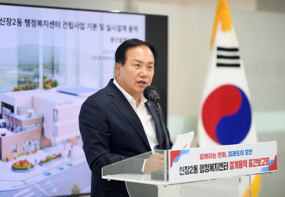 ▲ 이권재 오산시장이 신장2동행정복지센터기본및실시설계용역중간보고회에 참여해 설명하고 있는 모습 |