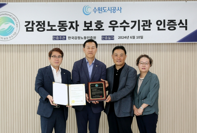 [뉴스서울] 수원도시공사는 10일 한국감정노동인증원으로부터 ‘감정노동자 보호 우수기관’으로 인증 받았다고 밝혔다.