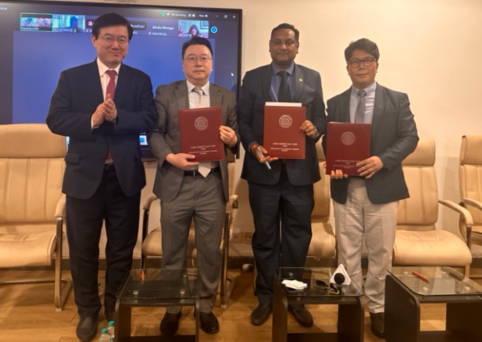 ▲ 인천경제자유구역청은 9일(현지 시간 기준) 인도 우타프라데시州 노이다에서 인도공과대학교 루르키와 ‘스마트시티 기술 관련 연구개발 협력을 위한 양해각서’를 체결했다. 윤원석 청장은 온라인으로 참여했다.(좌로부터 주영섭 서울대 교수, 김중백 IFEZ 정책특별보좌관, 아쉐이 드비베디 인도 공과대학교 루르키 학장, 피터 천 WSCF 의장) |