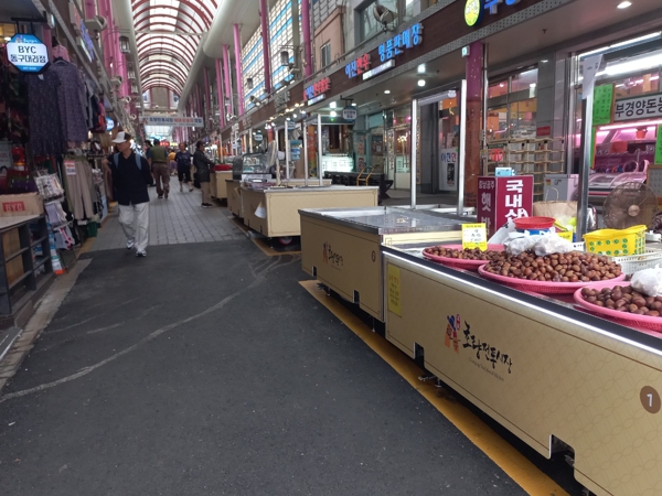 ▲ “깔끔해서 보기 좋네” 매대 교체로 새단장한 부산 동구 초량전통시장 |